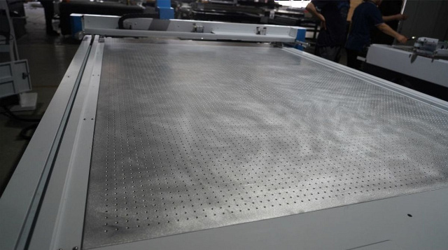 Рабочий стол станка выполнен из сложной сотовой системы толщиной 42 мм. Лицевой лист стола имеет множество отверстий для надежной фиксации материала в любой точке рабочего поля. В базовой комплектации стол разделен на 4 независимые зоны, которые включаются в автоматическом режиме. Покрытием стола является прочная войлочная ткань, которая выполняет функцию жертвенного стола.