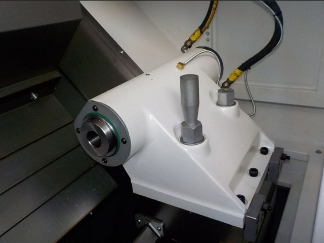 ![]() | Гидравлическая пиноль задней бабки На станке установлена гидравлическая задняя бабка. Движение задней бабки осуществляется по направляющим качения роликового типа. Управлять перемещением задней бабки можно через ЧПУ или от педали. Ход задней бабки составляет 130 мм. |